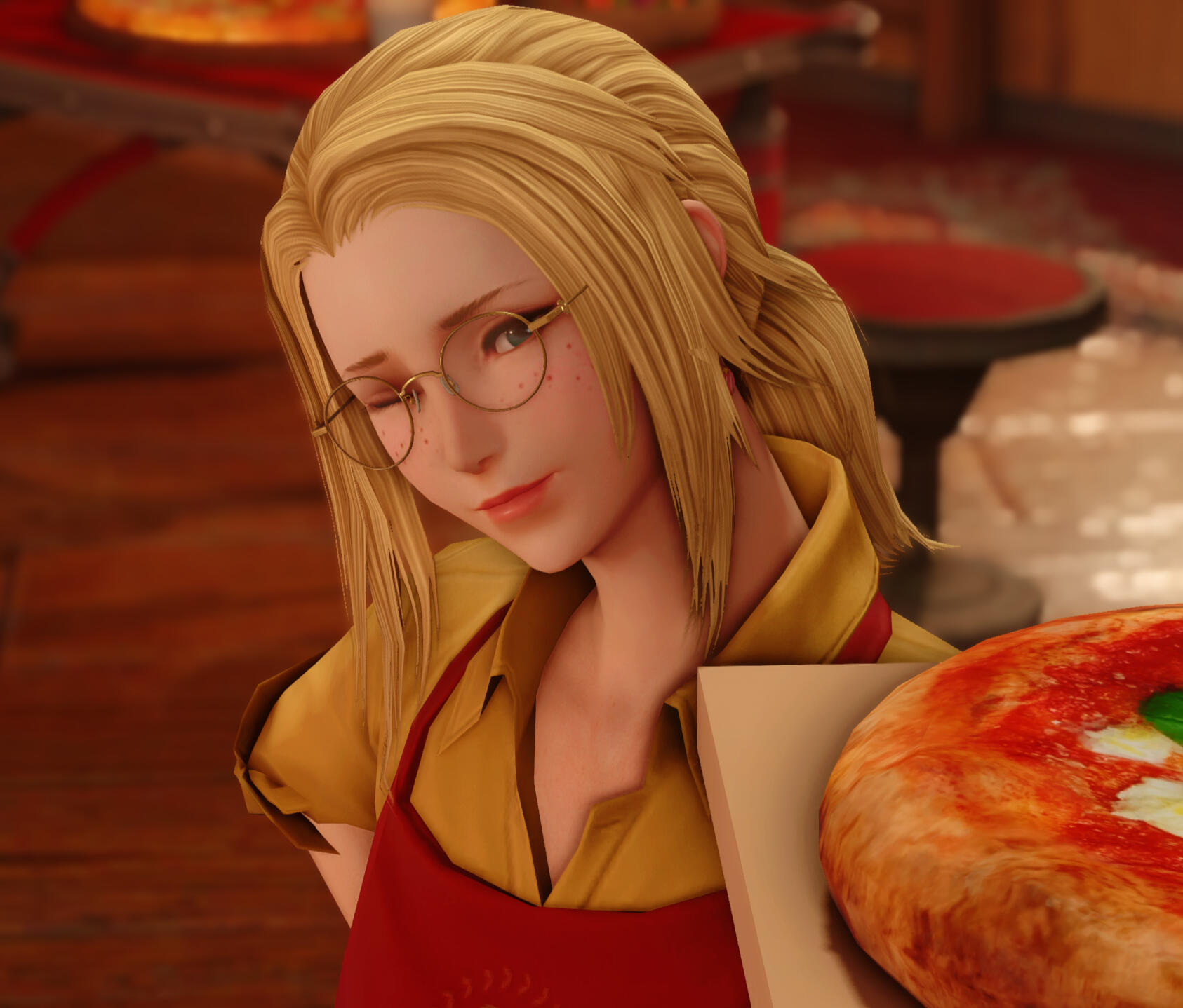 One meeting after another would see Sylve stumble across this Hyuran woman more often than he'd feel comfortable attributing to mere chance. Whether by the hand of fate, or perhaps the rumbling of his stomach, Marisa remains a relatively steady presence in Sylve's life—at least as far as that goes when his whims and wanderings are guided by little more than what direction the wind happens to be blowing on any given day.A self-described "Pizzaiola" and deliverer of baked goods, Marisa carries with her a certain warmth that seems to radiate well beyond whatever meal happens to be boxed up under her arm on any given day. Seemingly flush with equal parts kindness and passion for the culinary arts, her bespectacled innocence is infectious, to say the least, and a welcome respite from the usual fare Sylve contends with in his day to day life.Though he is still attempting to grasp the intricacies of her trade, her heart appears to be writ clear as day on her sleeve and in every bite. They say happiness comes in many forms, and in Marisa's case, it seems to be round, warm, and slathered in melted cheese.So it was that Marisa delivered not only a warm meal to Sylve that turned everything he thought he knew about bread, tomatos, and cheese on it's head—but also an unexpected slice of home, long forgotten and crowned in red.While faces have a tendency to come and go over the course of Sylve's wanderings, Marisa's is one he hopes remains present for a time. After all, there is still so much to learn about this Lominsan purveyor of sauced discs.